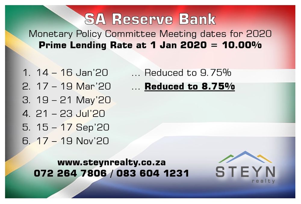 Considering the recent Covid-19 outbreak around the world ... and the subsequent affect it will have the economy and people’s pockets, the South African Monitory Policy committee announced a further 1% or 100 basis points drop in the Prime Lending Rate on 19 March 2020.